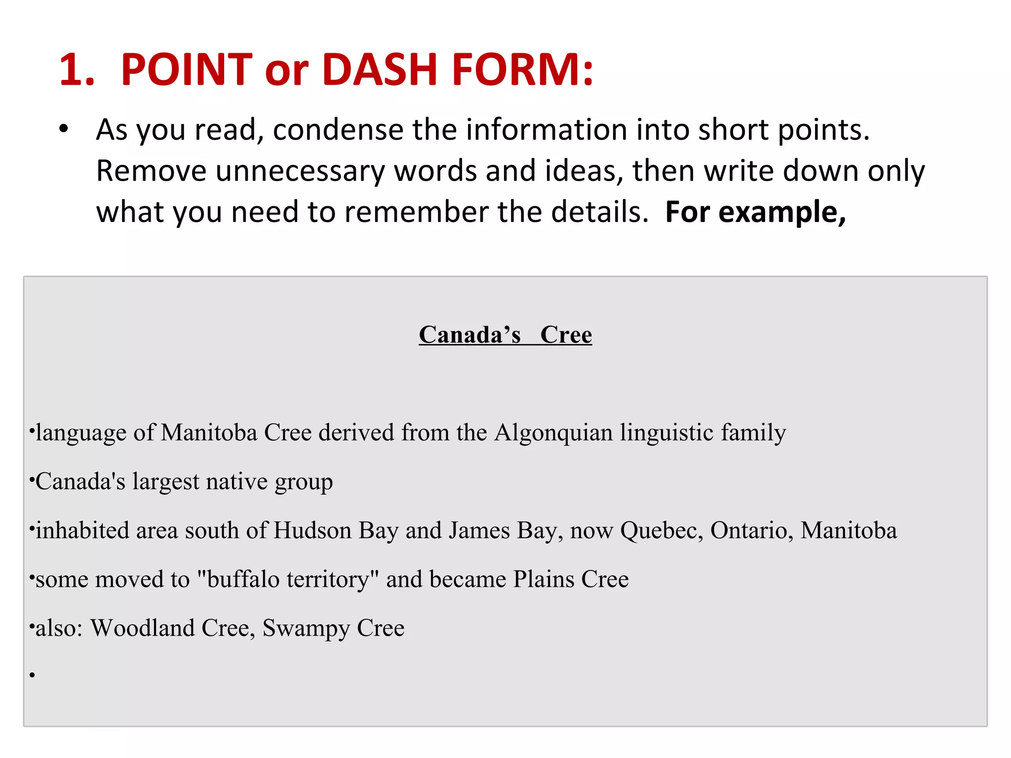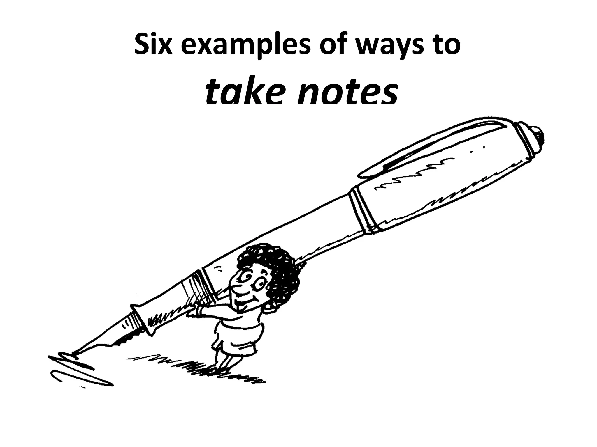 This document discusses six different note-taking styles: 1) Point form, 2) Web diagrams, 3) Outlines, 4) Study guides in question/answer format, 5) Two-column notes with key terms on the left and details on the right, and 6) A combo style using elements of the other styles. It also provides general guidelines for effective note-taking such as including a title and date, highlighting important concepts, developing shorthand symbols, and customizing the style to fit the content.
