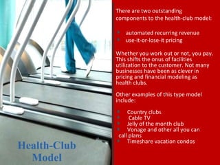 1) The health-club model uses automated recurring revenue and use-it-or-lose-it pricing even if customers don't utilize facilities.