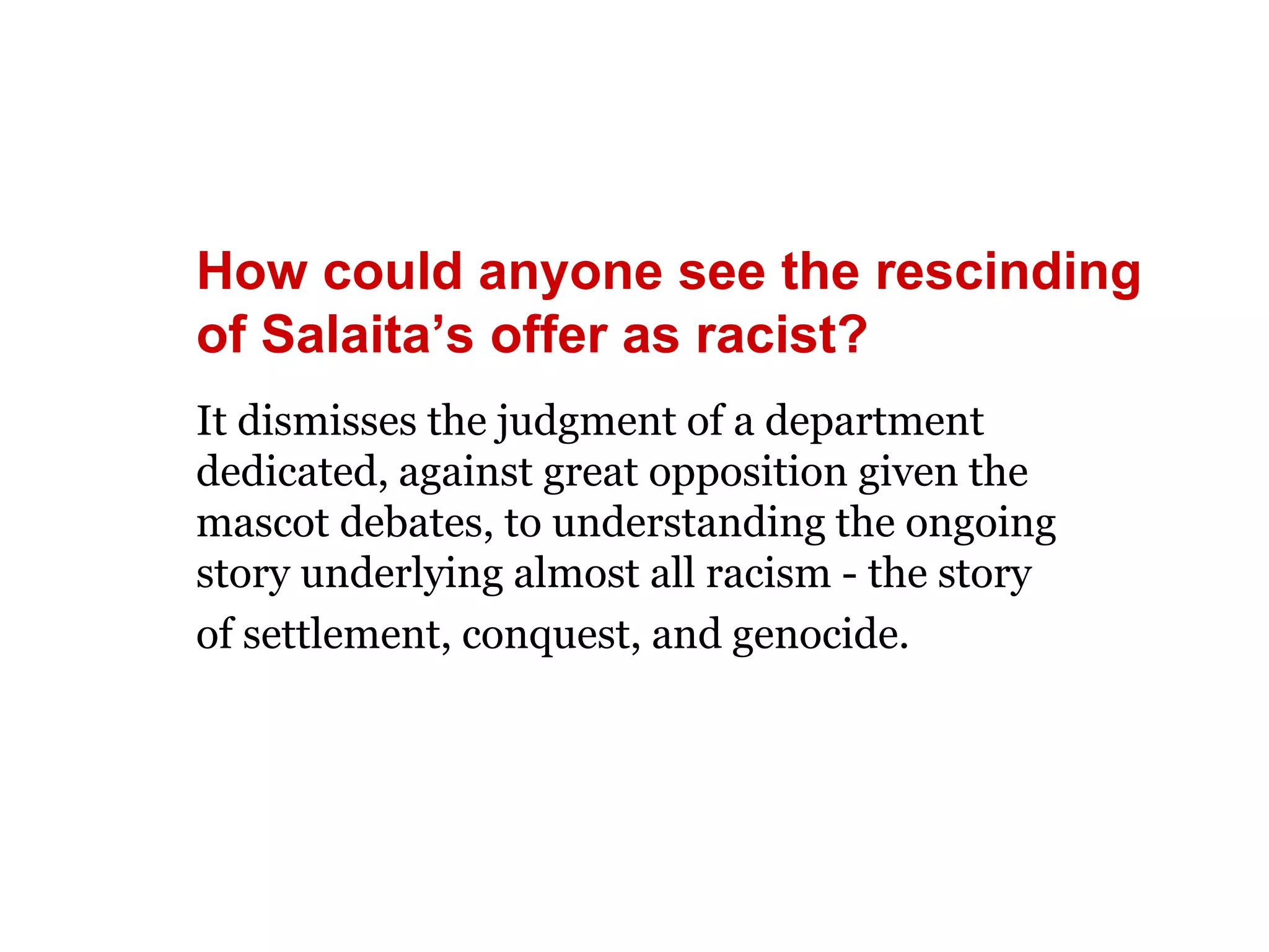 The document discusses the controversy surrounding the rescinding of Professor Salaita's job offer at the University of Illinois, arguing that such a decision may reflect systemic biases and undermines the authority of the hiring department. It emphasizes the importance of academic freedom and the rightful role of departments in matters of expertise and community impact. The document calls for acknowledging the wrongs done to the American Indian Studies program and suggests restorative justice as a path forward.