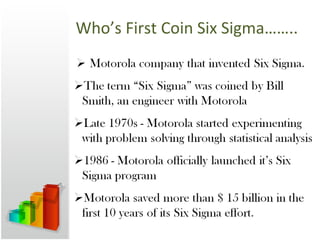 Six Sigma is a business management strategy aimed at reducing defects to 3.4 defects per million opportunities. It sets performance goals, enhances customer value, promotes learning, and executes strategic change. The Six Sigma initiative integrates improvement teams, problem solving teams, strategic planning, and more. Mumbai Dabbawalas deliver over 175,000 to 200,000 lunch boxes daily with only one mistake per 600,000 deliveries, achieving a six sigma quality level of 99.9999%. They have received six sigma certification from Forbes and ISO certification for their outstanding service. Other companies have also adopted Six Sigma methods for production, design, services, purchasing, and more.