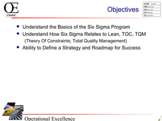This document provides an overview of Six Sigma and operational excellence. It defines Six Sigma as a management methodology that is customer-focused, data-driven, and aims for breakthrough performance gains and validated bottom line results. The document outlines the Define, Measure, Analyze, Improve, Control (DMAIC) methodology and how it relates to process improvement tools like Lean, Theory of Constraints, and Total Quality Management. It also provides examples of implementing a Six Sigma project, including defining the problem statement, measuring key metrics, analyzing data to identify root causes, improving the process, and controlling the results.
