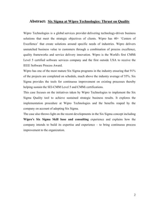 Wipro implemented Six Sigma to improve quality and drive continuous process improvement. Six Sigma aims for near perfection with no more than 3.4 defects per million opportunities. Wipro trained over 15,000 employees in Six Sigma, deployed over 1,000 projects, and saw significant benefits including reduced defects, increased on-time project delivery from 55% to 91%, and cost savings of over $230,000 per project. Moving forward, Wipro's challenges include sustaining improvements and transforming Six Sigma from a quality tool into an overall business methodology.