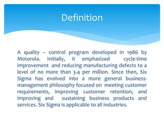 Six Sigma is a quality control program developed by Motorola in 1986 that aims for near perfection by striving to reduce defects to 3.4 per million opportunities. It uses a data-driven approach to eliminate defects in processes from manufacturing to services. Six Sigma has evolved from quality control to a general business management philosophy focused on meeting customer requirements. It provides tools to analyze processes, identify issues, and drive improvements. Major companies like GE, Microsoft, and Wipro have successfully implemented Six Sigma.