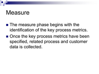 The measure phase involves identifying key process metrics and collecting related data. This helps validate the data and narrow potential causes for investigation. Measurement system analysis ensures the measurement system is acceptable by examining properties like bias, stability, linearity, repeatability and reproducibility. A gage R&R study uses a crossed design to evaluate the repeatability and reproducibility of a measurement system by having multiple operators take multiple measurements of various parts. Minitab can be used to analyze gage R&R data through run charts, ANOVA and determining each source of variation's contribution.