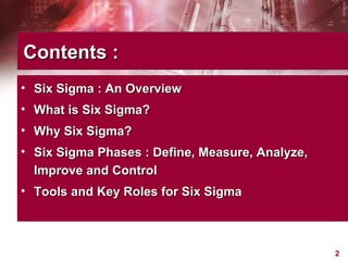 This document provides an overview of Six Sigma, including what it is, why companies use it, and the typical phases and tools involved. Six Sigma is a statistical approach to process improvement that aims for near perfect production quality. It follows the DMAIC cycle of Define, Measure, Analyze, Improve, and Control phases to reduce defects. Key tools include process mapping, design of experiments, measurement system analysis, and XY matrices. The goals are to save money by reducing costs and increasing customer satisfaction through lower defect rates.