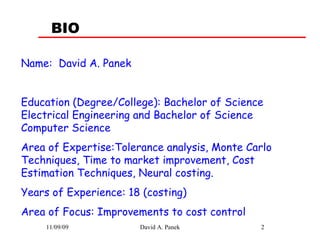 David A. Panek has 18 years of experience in cost engineering. He has expertise in tolerance analysis, Monte Carlo techniques, cost estimation, and neural costing. The document discusses different methods for tolerance analysis including worst case, statistical, and six sigma approaches. It also defines terms related to process variation and discusses measures of process capability like Cp and Cpk. Guidelines are provided for designing optimized tolerances through establishing process standard deviation and computing probabilities to achieve tight assembly gaps.