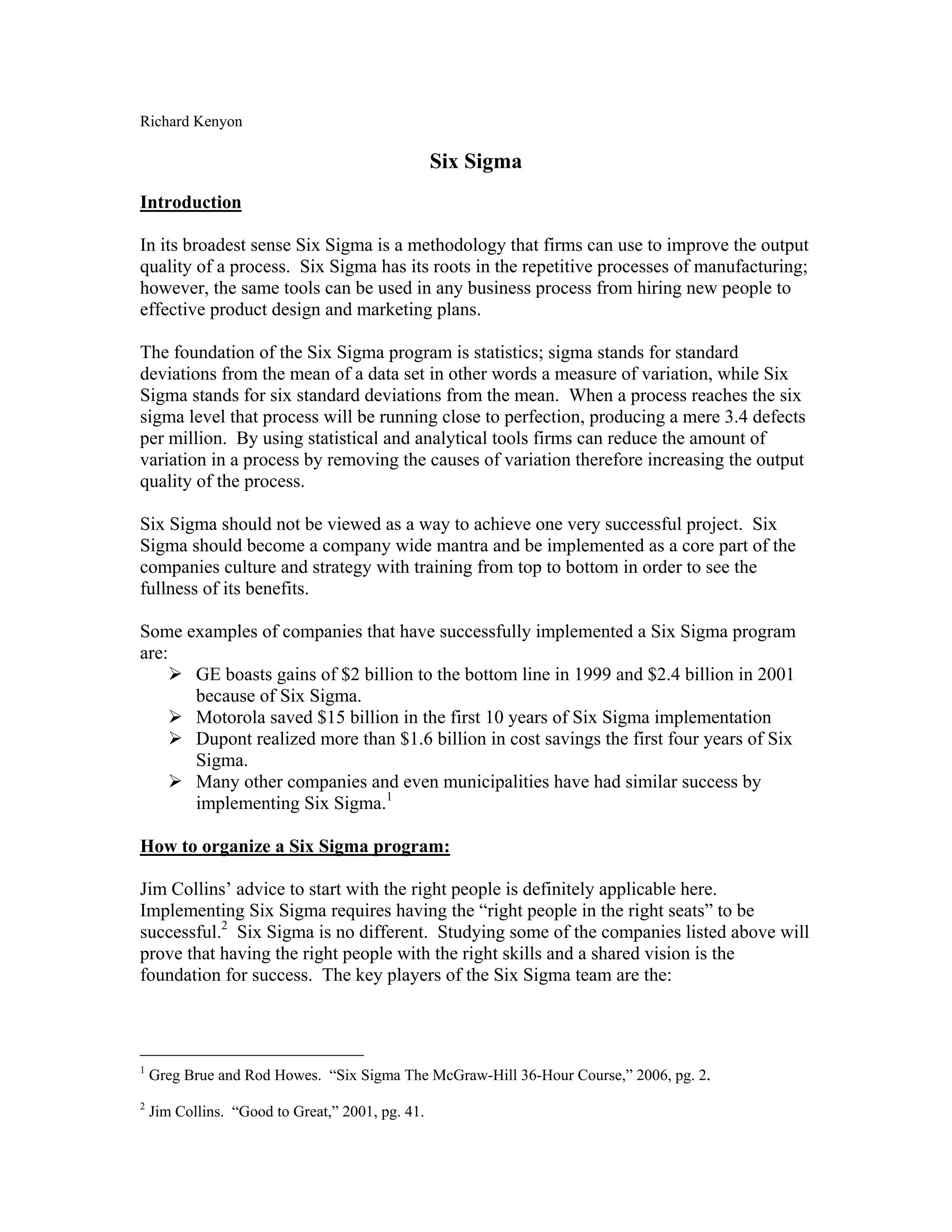 Six Sigma is a methodology that uses statistical tools to improve process outputs and reduce defects. It aims to achieve near perfection by reducing process variation. The foundation of Six Sigma is statistics, using measures like standard deviation to quantify variation. Companies that implement Six Sigma company-wide, with training from top to bottom, tend to see the greatest benefits. Successful implementation requires the right people in leadership roles, including Champions, Master Black Belts, Black Belts, and Green Belts. These roles work together on projects using various statistical tools to identify and eliminate sources of process variation. An example project analyzed the computer order and shipping process to reduce customer complaints by tracing defects back to their root causes.