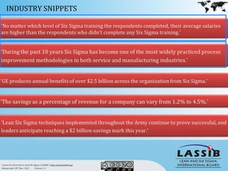 Six Sigma is a methodology aimed at improving business performance by reducing costs, enhancing customer satisfaction, and increasing operational efficiency. It involves a structured problem-solving approach, utilizing phases such as define, measure, analyze, improve, and control to identify and eliminate root causes of issues. The ultimate goal is to create a more competitive and sustainable organization through continual improvement.