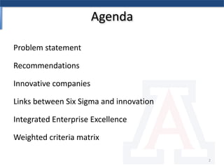 The document discusses the relationship between Six Sigma methodologies and innovation within organizations, emphasizing that Six Sigma should not be directly applied to innovation activities as it may hinder creativity. Recommendations include using Six Sigma to enhance processes that support innovation and adopting an integrated enterprise excellence model to align innovation with analytics. It also presents a research methodology and various frameworks for managing innovation effectively while fostering a collaborative organizational culture.