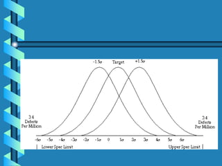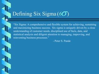 Six Sigma is a data-driven approach to process improvement that aims to reduce defects. It was introduced by Motorola in 1987 and involves defining, measuring, analyzing, improving, and controlling processes to minimize errors. The goal of Six Sigma is to operate processes with as close to zero defects as possible by reducing process variation. A Six Sigma process is one that produces only 3.4 defects per million opportunities. Key aspects include using statistical tools and methodologies, such as DMAIC, to systematically identify and remove sources of errors and variation in order to improve quality, lower costs, and increase customer satisfaction.