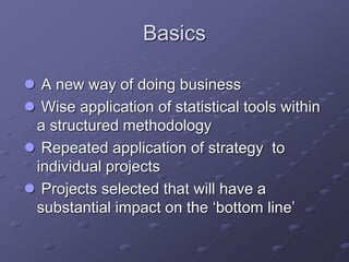 Six Sigma is a data-driven methodology for improving processes by eliminating defects. It involves the following key aspects: