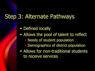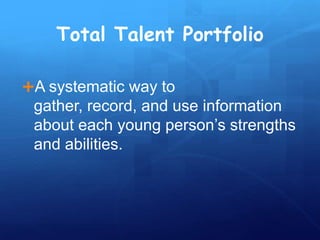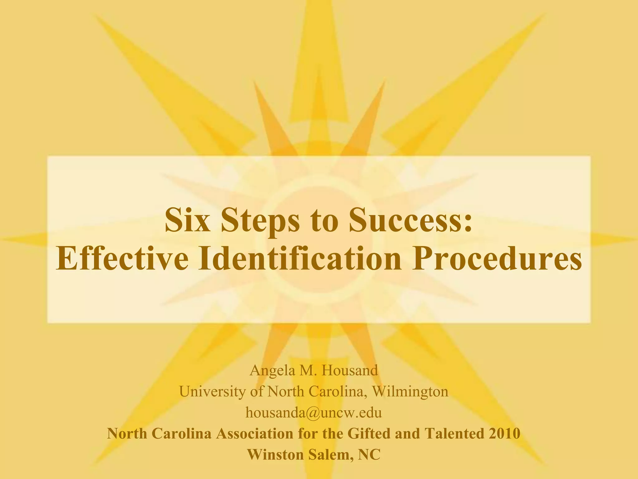 The document outlines a six-step strategy for identifying gifted and talented students, emphasizing the importance of understanding gifted behaviors and employing diverse identification procedures that reflect local demographics and needs. It highlights key considerations in the identification process, including the distinction between high performance and high potential and the necessity of using multiple criteria and tools. Additionally, it discusses the necessity of flexibility, community involvement, and regular updates to ensure inclusivity in the identification of gifted students.