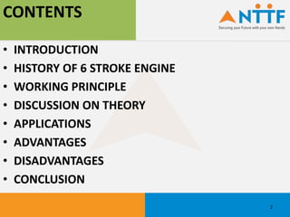 The document presents an overview of the six-stroke engine, detailing its history, working principles, and applications. It highlights the technology's advantages such as increased efficiency and power output, while also noting its complexities and costs. The conclusion emphasizes the potential of six-stroke engines as a future technology in the automotive industry, supported by ongoing research and patents.