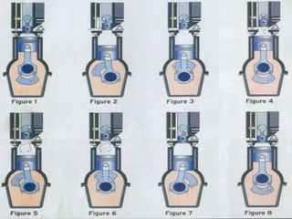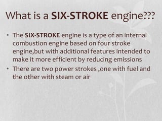 The six-stroke engine is an internal combustion engine that builds upon the four-stroke engine design to increase efficiency. It has two approaches - the first uses the same piston for two additional strokes, while the second uses a second opposed piston moving at half the rate of the main piston. The six-stroke engine injects water into the combustion chamber on the power stroke, turning it instantly into steam for an additional power stroke. This provides increased efficiency over traditional engines by extracting work from heat otherwise lost and reducing emissions and fuel consumption by up to 40%. However, challenges include potential piston damage from thermal expansion and ensuring an adequate water supply.
