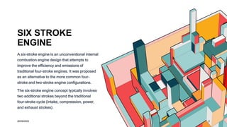The six-stroke engine is an innovative design that enhances efficiency and reduces emissions by introducing two additional strokes to the traditional four-stroke cycle. It features a water injection stroke to cool the engine and lower pollutants, followed by an air injection stroke to improve combustion. Although it presents several advantages, the six-stroke engine is still experimental and uncertain for widespread automotive use.
