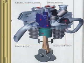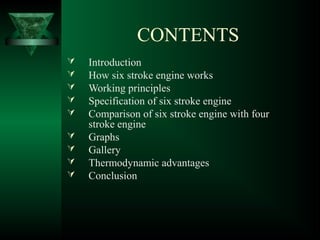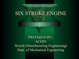 The document discusses the innovative six-stroke engine developed by Malcolm Beare, which combines features of two-stroke and four-stroke engines, leading to increased power and torque while simplifying engine design. Key benefits include reduced complexity, fewer engine parts, and greater thermodynamic efficiency compared to traditional engines. The six-stroke engine can be retrofitted onto existing four-stroke engines with minimal modifications, making it a cost-effective alternative in engine technology.