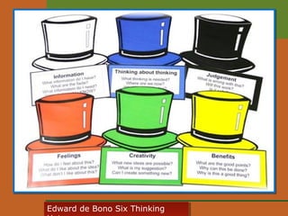 The document discusses Edward de Bono's Six Thinking Hats technique for parallel and effective problem solving. The technique involves assigning six colored hats to represent six types of thinking: white for objective facts, red for emotions, black for caution, yellow for optimism, green for creativity, and blue for organization and control. A group addresses a problem or project by having structured discussions during which members must only consider the aspect of thinking represented by the hat they are "wearing" at that time. This allows the group to explore issues from different perspectives in an orderly manner to arrive at well-rounded solutions. The document provides details on how the technique can be applied to define problems, generate and evaluate ideas, and develop implementation strategies.
