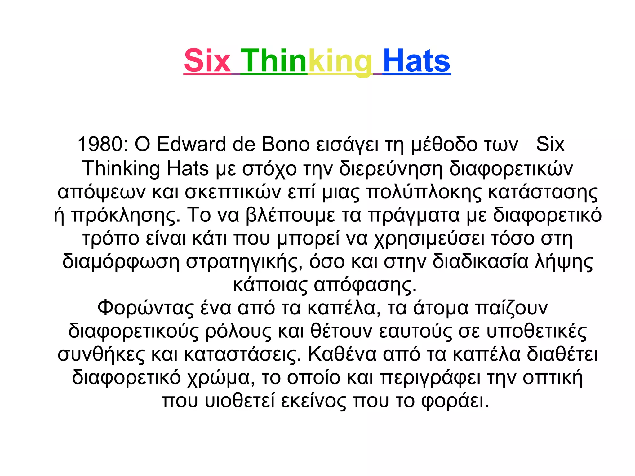 Thinking Hats με στόχο την διερεύνηση διαφορετικών
