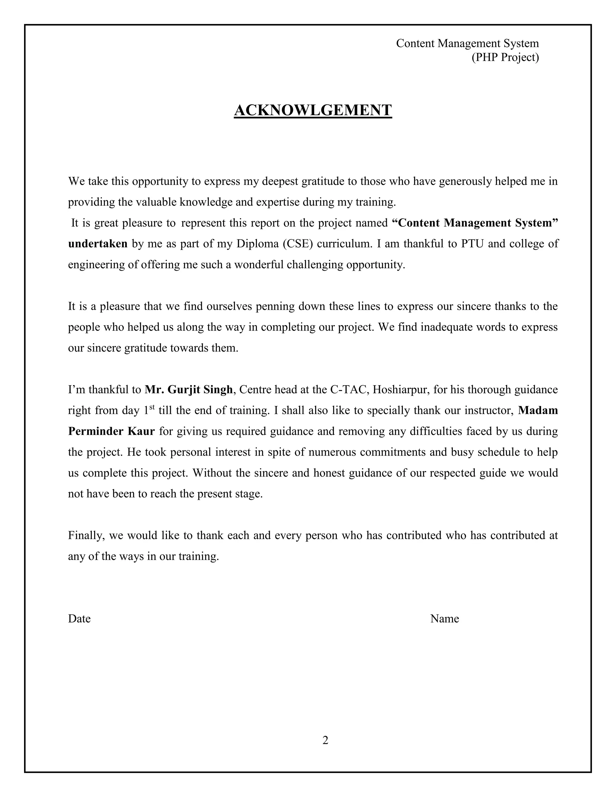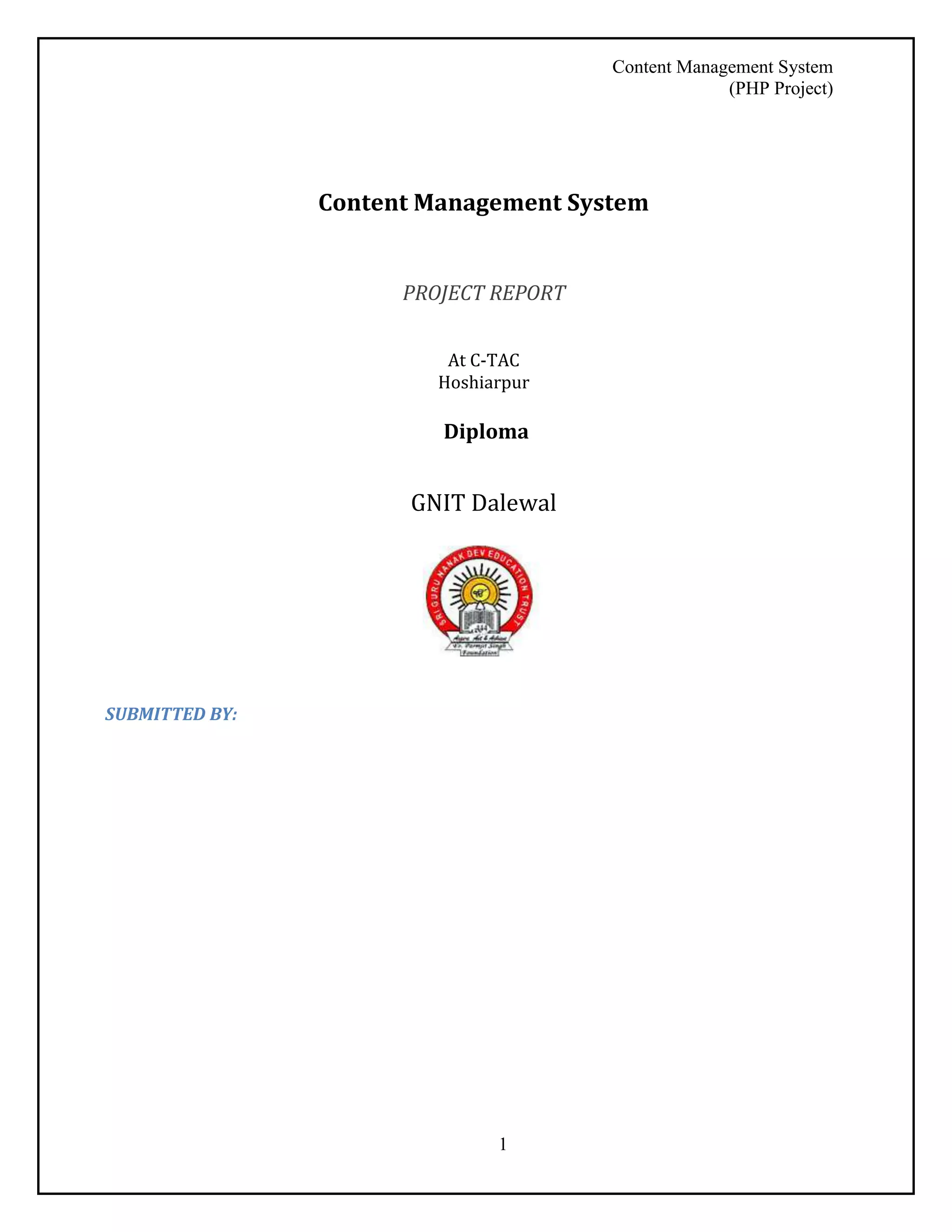 The document presents a project report on a Content Management System (CMS) developed using PHP, part of a diploma curriculum. It outlines the project’s objectives, hardware and software requirements, and provides a comparison of open-source CMS products. Additionally, it covers key technologies involved, including HTML, CSS, and JavaScript, along with their functionalities and applications in web development.