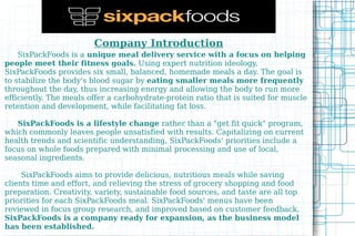SixPackFoods is a meal delivery service that provides six small, nutritionally balanced meals per day to help clients meet fitness goals like losing weight or building muscle. The meals are homemade using whole, local ingredients and delivered in reusable containers to reduce waste. Compared to competitors, SixPackFoods uniquely focuses on nutrition for fitness rather than just weight loss and eliminates the chore of daily meal planning for clients. An investment of $20,000 would allow for expanding operations through marketing and hiring additional staff.