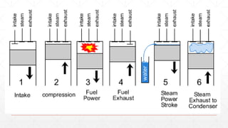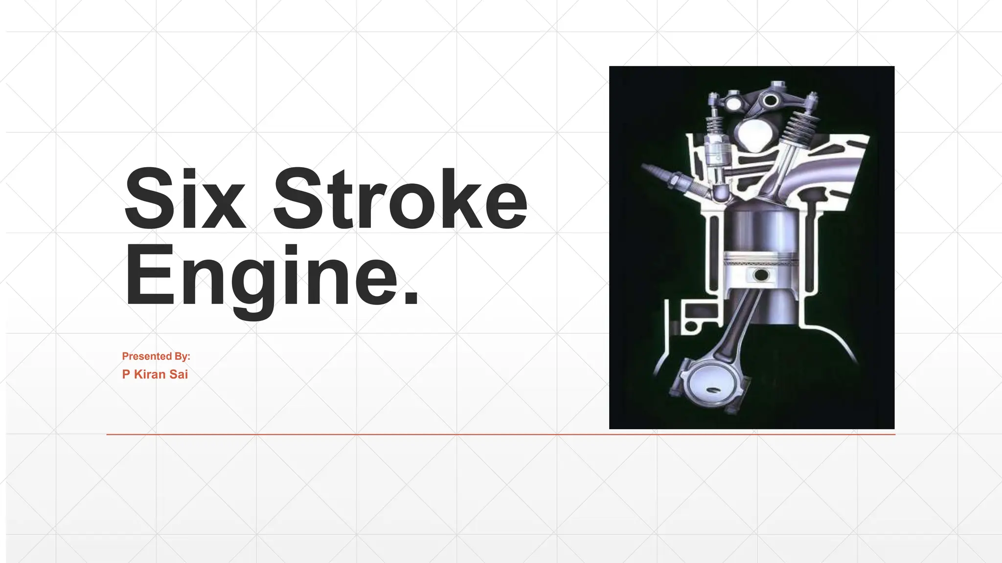 The document describes a six-stroke engine, which has two power strokes compared to the one power stroke of a conventional four-stroke engine. It works by using steam or air as a working fluid during an additional power stroke to extract more power from the engine and increase its efficiency by around 40% compared to a four-stroke Otto cycle engine. The document discusses the working principle, modifications made to the engine like the cam shaft design and water injector, analysis of metrics like pressure/volume diagram, fuel flow rate and thermal efficiency, as well as advantages and limitations of the six-stroke engine.
