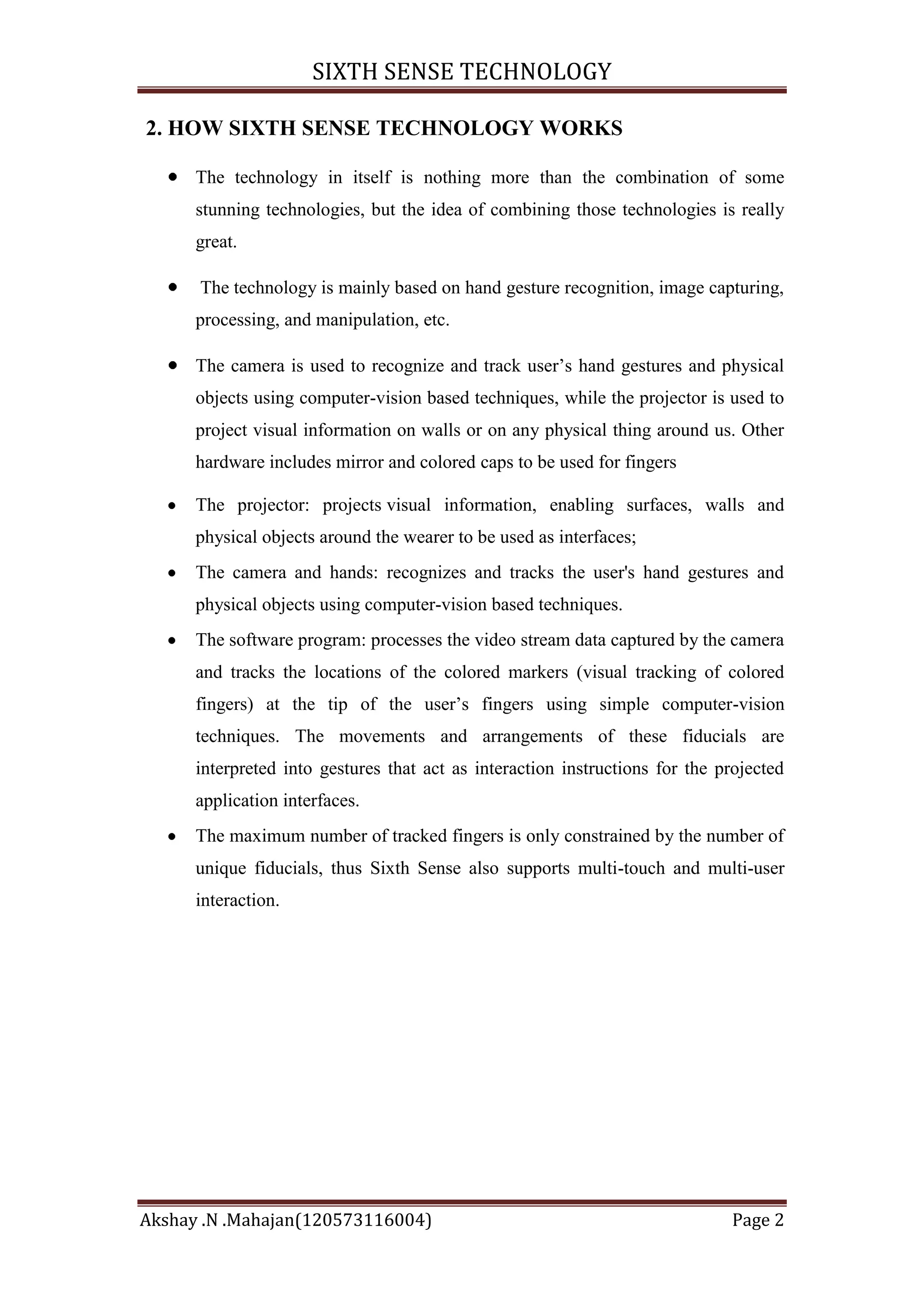 The Sixth Sense technology is a wearable device that consists of a mini projector, camera, and cell phone. It projects digital information onto physical surfaces and objects using the projector. The camera recognizes hand gestures and objects, allowing users to interact with the projected information through natural hand movements. It aims to seamlessly integrate digital information into the real world to make any surface a potential display.
