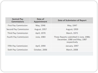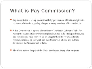 The document summarizes key details about the six pay commissions in India. It discusses the establishment and recommendations of the first through sixth pay commissions. Some highlights include: