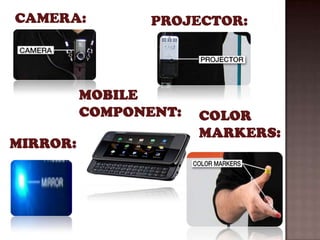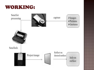 Sixth Sense is a wearable gestural interface that augments the physical world with digital information. It uses a camera, projector, and mirror mounted on a pendant to project information onto surfaces based on hand gestures. Applications include making calls, getting maps and directions, viewing videos, taking photos, and accessing information about products, books, and people. The technology supports multi-touch and user interaction and has potential for use in gaming, education, and assisting disabled individuals through recognition of objects and gestures.