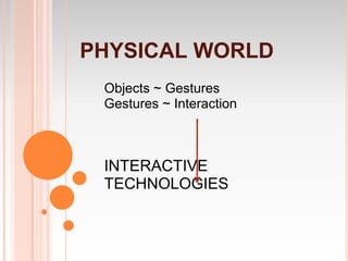 Rakesh Kumar presented on Sixth Sense technology, a wearable gestural interface that augments the physical world with digital information. It allows users to interact with surfaces like walls and objects using natural hand gestures captured by a camera and processed by a smartphone to project digital information back onto the surfaces. Some applications include telling time by drawing a circle on the wrist, getting product information through image recognition, and zooming in maps using pinch gestures. The presenter concluded Sixth Sense can help integrate digital information into everyday objects without isolating users from the physical world.