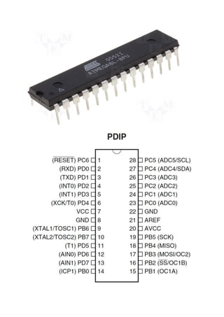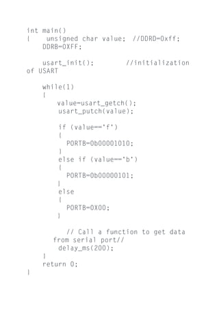 The document describes a project to create a sixth sense robot using an Atmel ATMega8 microcontroller development board. The robot uses computer vision techniques to track colored markers on a user's fingers to interpret gestures and send commands to control motors on the robot. Specifically, it captures images with a webcam, processes them to detect different colored markers, and sends signals to an H-bridge motor controller to move the robot forward, backward, or turn based on the detected gesture. The code uses color thresholding algorithms to identify pixels matching the colors of each marker and determine the gesture.