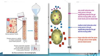 Size exclusion chromatography separates molecules based on their size or hydrodynamic radius. It uses a column packed with porous beads that allow smaller molecules to enter the pores while restricting the entry of larger molecules. This results in larger molecules being eluted first from the column followed by smaller molecules. It is commonly used to determine the molecular weight distribution of polymers and to purify proteins, nucleic acids, and other biomolecules.