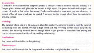 Size reduction is the process of reducing large substances into smaller particles through grinding, cutting, or emulsification. For pharmaceutical purposes, nano-sized particles are optimal. The objectives of size reduction include increasing surface area and absorption. Factors like hardness, toughness, and softening temperature affect the size reduction process. Common size reduction equipment includes fluid energy mills, ball mills, edge runner mills, end runner mills, and hammer mills. Each uses mechanisms like impact, attrition, shearing, or a combination to break down materials. Key considerations are achieving the desired particle size while avoiding contamination or decomposition from heat.