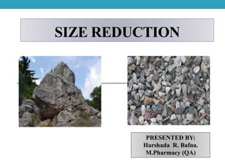 Size reduction is the process of reducing larger particles into smaller particles using external forces. It has several objectives like increasing surface area, separating constituents, improving handling, and facilitating mixing. The key mechanisms of size reduction are cutting, impact, compression, attrition, and combined impact and attrition. Several types of mills are used for size reduction including cutter mills, roller mills, hammer mills, ball mills, fluid energy mills, and edge runner mills. Factors like hardness, moisture content, and ratio of feed size influence size reduction effectiveness.