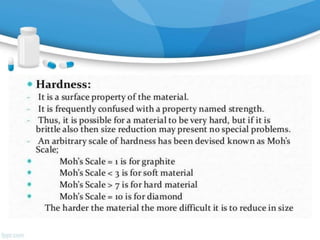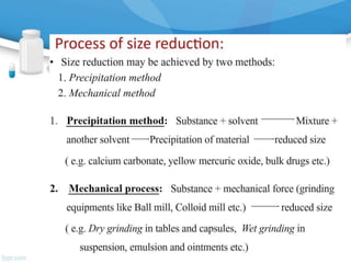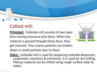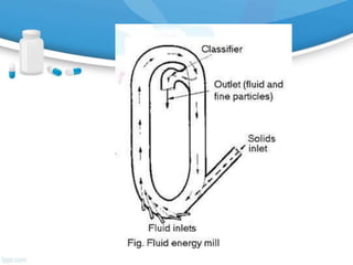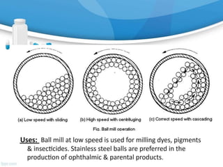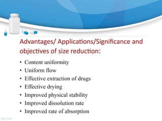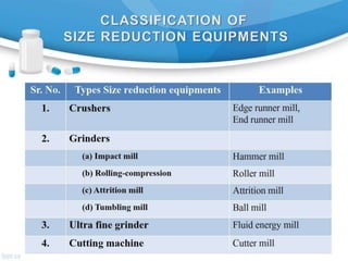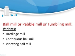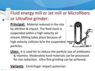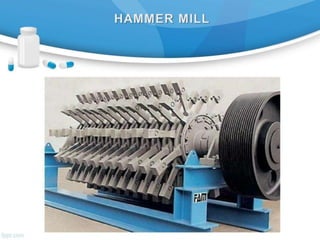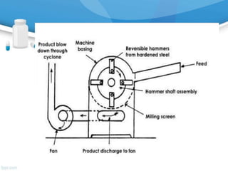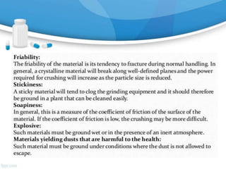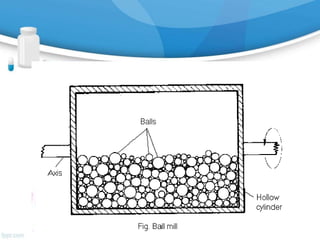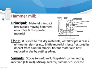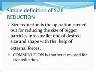 The document discusses various theories of size reduction, including Rittinger's, Bond's, Kick's, and Walker's theories. It also covers different types of equipment used for size reduction, including hammer mills, ball mills, and roller mills. Rittinger's theory suggests energy required is proportional to new surface area created. Bond's theory states energy used for crack propagation is proportional to new crack length. Kick's theory relates energy to ratio of size change, and Walker's theory generalized the energy-size relationship. Advantages and disadvantages of hammer mills, ball mills, and roller mills are provided.