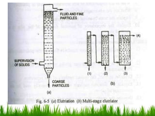 This document discusses various methods for size separation of powders, including sieving, cyclone separation, air separation, and elutriation. It provides details on the standards for different powder sizes according to the Indian Pharmacopoeia and describes the construction and working of common separation devices like sieves, cyclones, and air separators. The key methods covered are sieving, where powders are separated based on particle size by passing through a set of sieves, and elutriation, where separation occurs as particles of different densities settle at different rates in a moving fluid.