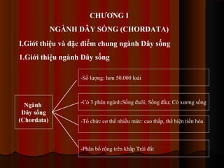 Bài giảng giới thiệu về ngành dây sống (chordata) với hơn 50.000 loài và ba phân ngành chính: sống đuôi, sống đầu và có xương sống. Các đặc điểm chung của ngành này bao gồm sự hiện diện của dây sống, ống thần kinh trung ương và khả năng có đuôi. Phân loại sơ bộ ngành dây sống và động vật có xương sống cũng được trình bày, nhấn mạnh sự đa dạng và tiến hóa của chúng.