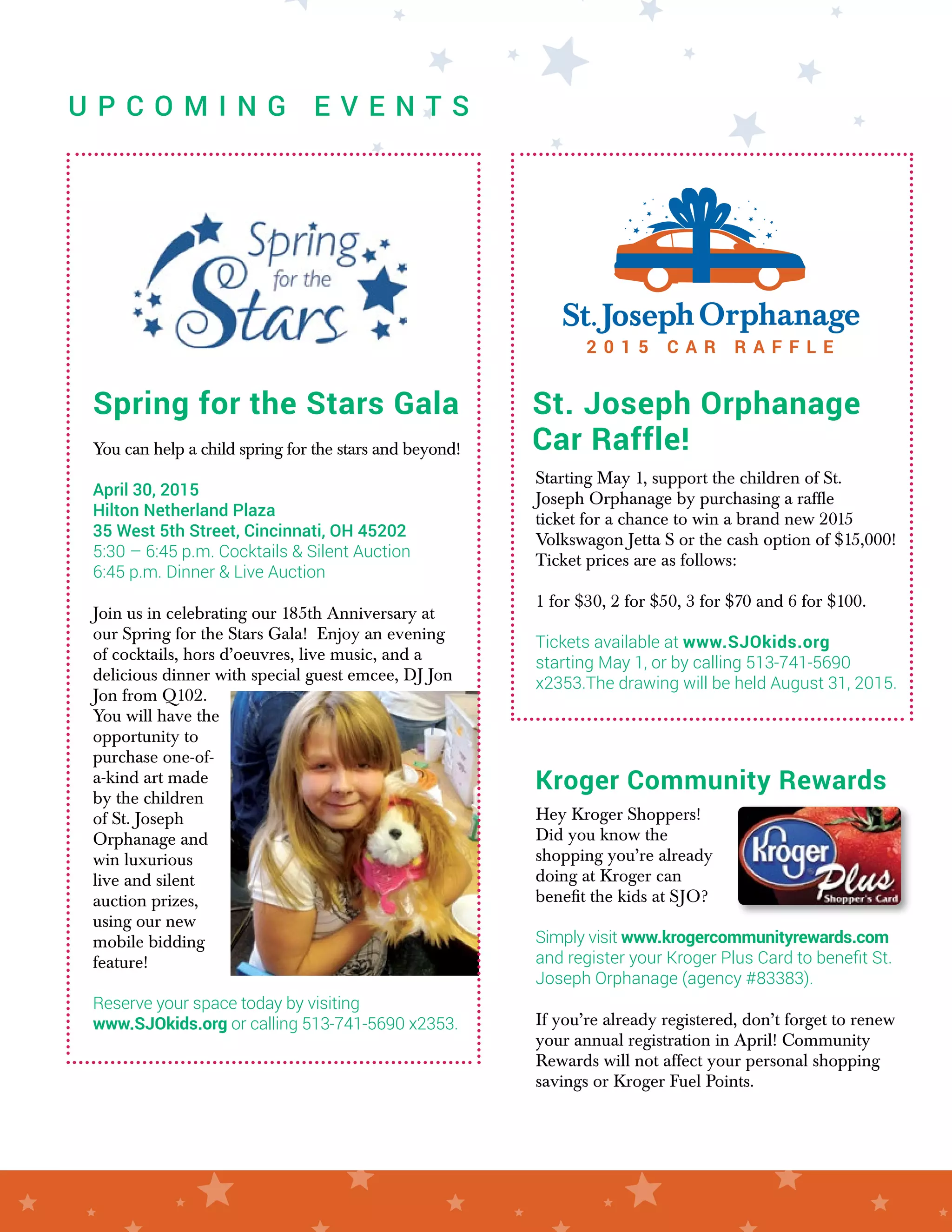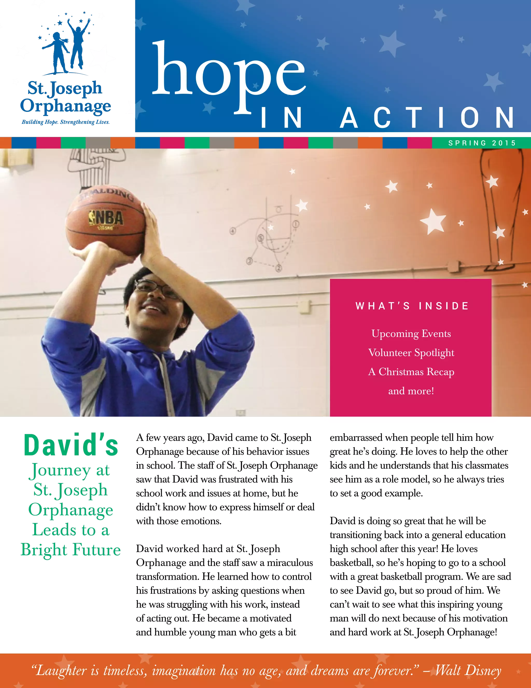 The document provides information about upcoming events and recent happenings at St. Joseph Orphanage. It summarizes David's journey of overcoming behavioral issues through the support of St. Joseph Orphanage. It also highlights volunteer Jeff Rosa who has supported the orphanage for 12 years and helped provide Christmas celebrations for the children. The document recaps the successful holiday season and thanks donors who helped make wishes come true.