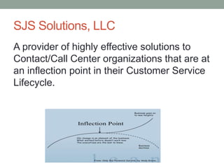 SJS Solutions, LLC is a provider of consulting services for contact and call centers that focuses on leveraging technology, motivating employees, and establishing metrics to improve operations. The company helps centers implement innovative technologies to reduce costs by 25% while improving customer experience. SJS also leads initiatives to restructure centers, reducing expenses by millions through capacity design and organizational changes. Recent projects include strategic planning for a merger and outsourcing assessments for large contact centers.