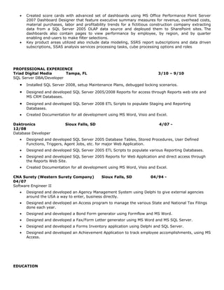 This document provides a summary of Stephen Stombaugh's skills and experience as a Business Intelligence Professional with over 15 years of experience developing solutions using SQL Server and Microsoft technologies. He has extensive experience designing databases, ETL processes, cubes, reports and dashboards to support business analytics and decision making. His most recent role focused on implementing BI solutions for construction labor analysis and book publishing metrics.