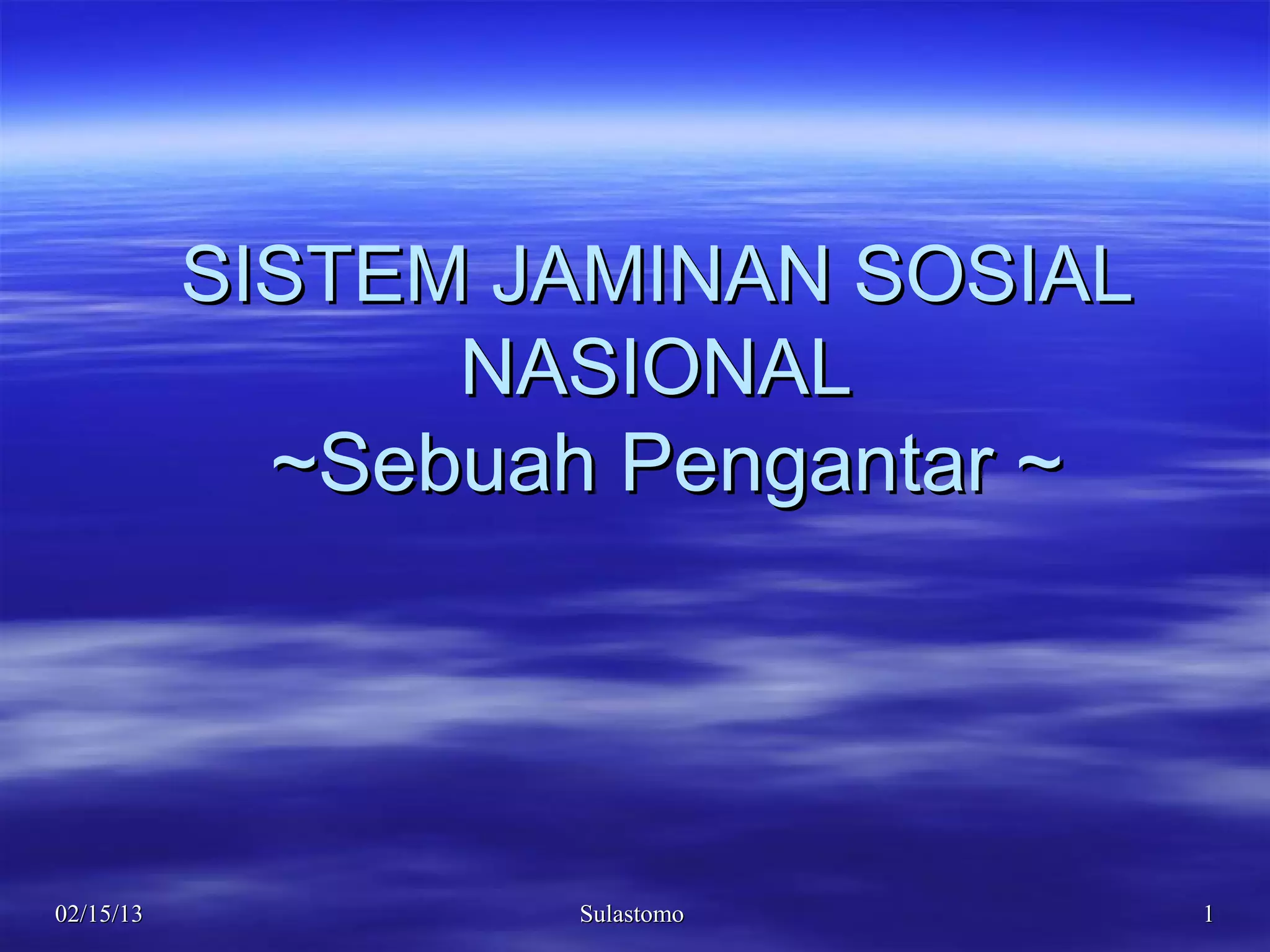Dokumen ini membahas sistem jaminan sosial nasional sebagai upaya pemerintah untuk meningkatkan kesejahteraan rakyat Indonesia melalui berbagai mekanisme seperti asuransi sosial, bantuan sosial, dan pelayanan sosial. Selain itu, dijelaskan prinsip-prinsip dan kerangka hukum yang mendasari sistem ini, serta jenis-jenis manfaat yang diberikan kepada peserta. Program ini berencana untuk menjangkau seluruh rakyat secara bertahap, dengan fokus pada kelompok masyarakat miskin dan formal.
