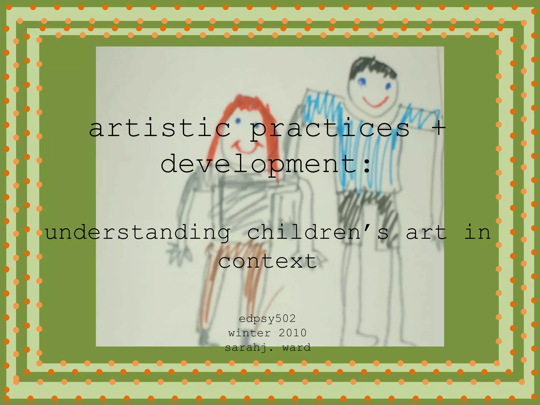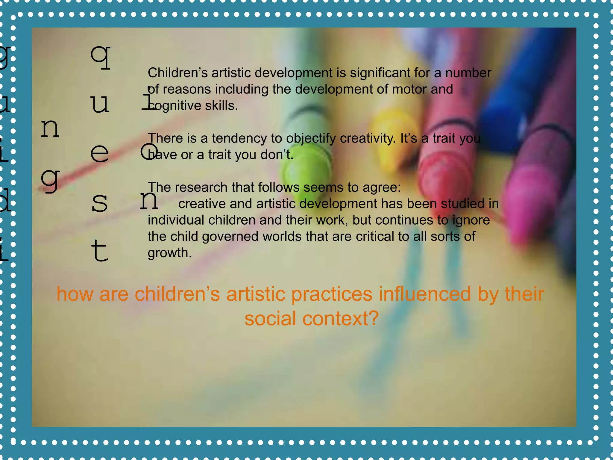 This document discusses children's artistic development in context. It notes that children's creativity is influenced by their social environments and interactions. The research aims to study children's art in the contexts in which it naturally occurs, among peers. Key aspects of artistic development discussed include fine motor skills, cognitive development, and the influence of social contexts on identity formation and the Zone of Proximal Development. The document advocates research methods that avoid adult biases and interpretations, instead allowing children's own ideas to be heard. It provides examples of children's artwork and discussions during a drawing activity to demonstrate social influences on their creative processes.