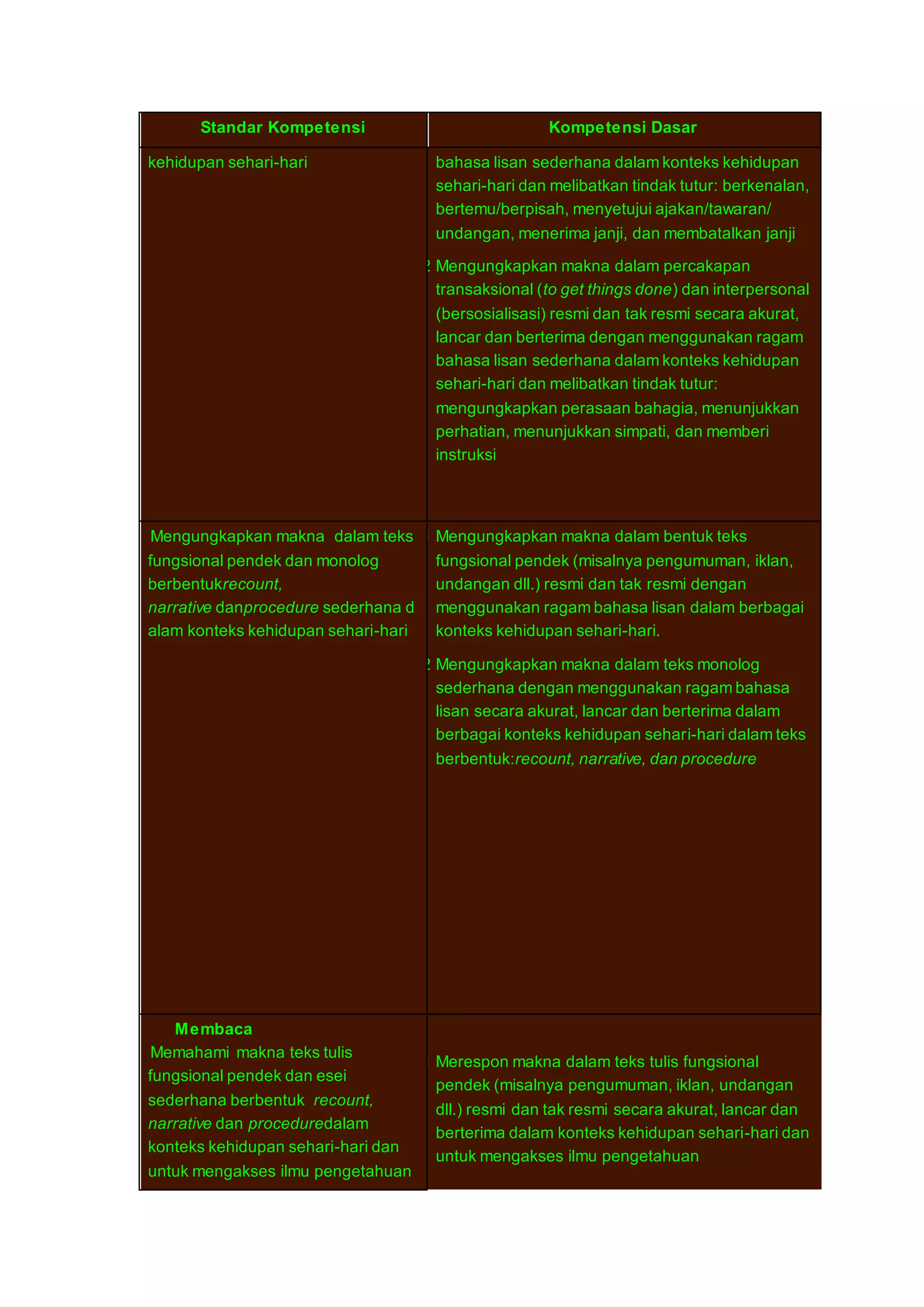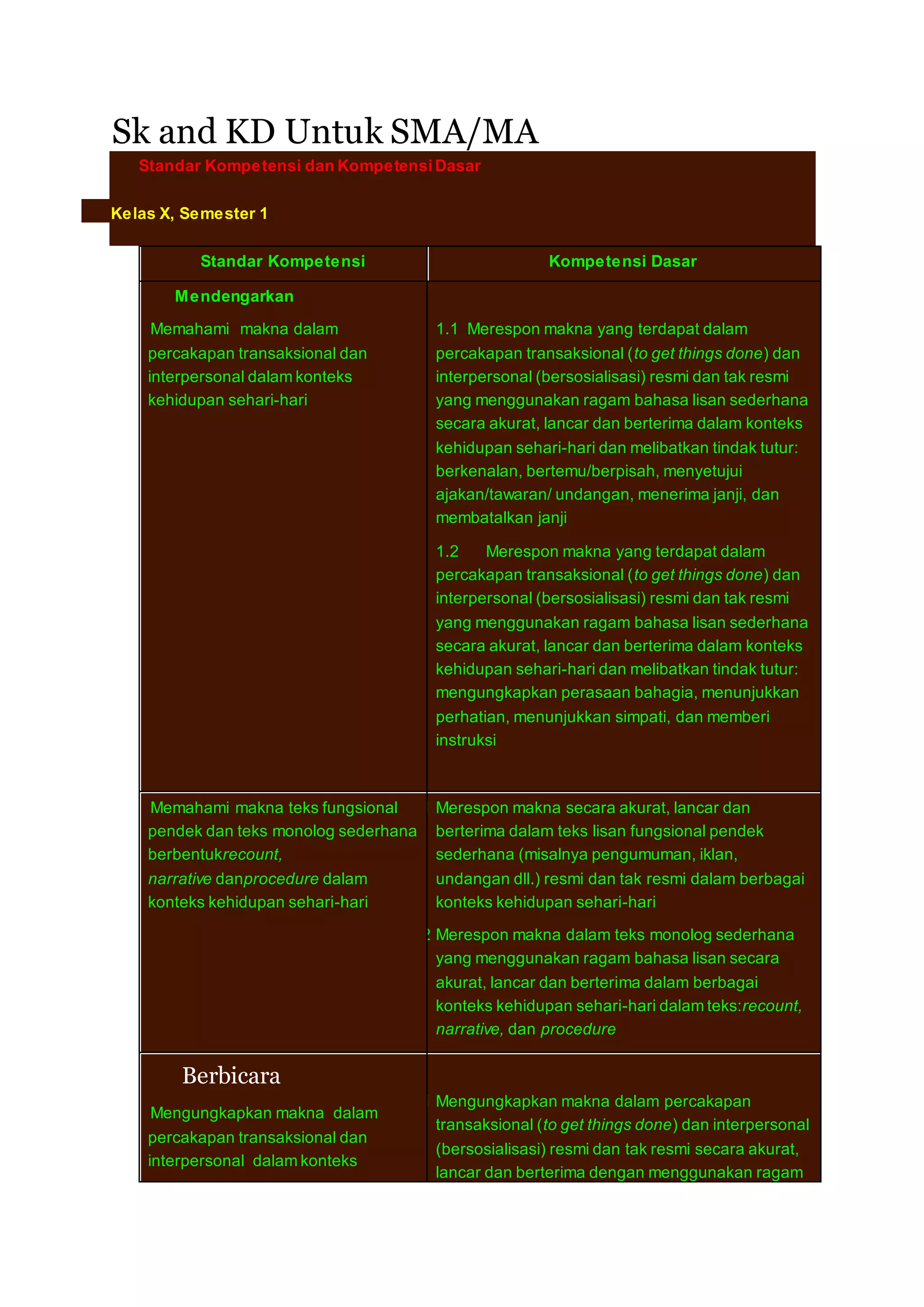 Dokumen ini mencakup standar kompetensi dan kompetensi dasar untuk siswa SMA/MA pada kelas X dan XI, semester 1 dan 2, yang menitikberatkan pada keterampilan mendengarkan, berbicara, membaca, dan menulis. Fokus pembelajaran termasuk pemahaman makna dalam percakapan, teks fungsional, dan teks monolog sederhana serta kemampuan untuk mengekspresikan makna dalam berbagai konteks kehidupan sehari-hari. Materi juga mencakup penguasaan ragam bahasa lisan dan tulisan dalam percakapan resmi dan tidak resmi.