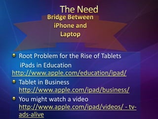 The document discusses the use of iPad tablets to address low student performance in mathematics at BHHS. It describes how only 11% of students currently score 65% or higher in math and the assistant principal wants to increase this to 65%. The document then provides background on the development and adoption of tablet technologies like the iPad in education. It discusses how iPads could create an interactive learning environment and increase student performance if used as an instructional tool in the BHHS math classroom.