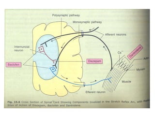 This document discusses neuromuscular blockers (muscle relaxants) including their physiology, classification, and role in surgery. It describes how muscle relaxants work by blocking acetylcholine receptors at the neuromuscular junction, classifying them as depolarizing or non-depolarizing. Specific muscle relaxants are outlined, their mechanisms of action, durations, and side effect profiles. The document also briefly discusses centrally-acting muscle relaxants and direct acting drugs like dantrolene. Choice of muscle relaxant depends on factors like required duration, excretion route, and side effect risks.