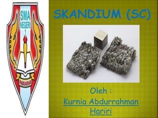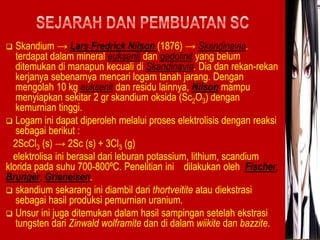 Skandium pertama kali ditemukan pada tahun 1879 melalui analisis spektral mineral euksenit dan gadolinit dari Skandinavia. Logam ini umumnya ditemukan dalam mineral seperti thortveitite, bazzite, wolframite, dan wiikite. Skandium merupakan logam lunak berwarna keperakan yang mudah bereaksi dengan halogen, oksigen, air, dan asam klorida.
