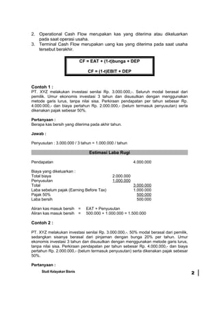 Dokumen tersebut membahas beberapa aspek keuangan dalam menilai kelayakan suatu proyek investasi, termasuk estimasi biaya investasi awal, biaya operasi, dan pendapatan, serta indikator keuangan seperti payback period, net present value, dan internal rate of return.
