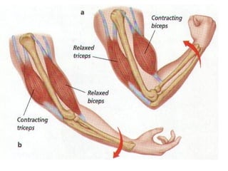 The document provides an overview of the skeletal and muscular systems. It discusses that the skeletal system includes bones, cartilage, joints, ligaments and tendons. It notes there are 206 bones in the adult human body and more in infants. The document outlines the two parts of the skeletal system, named the axial and appendicular skeletons, and describes the three types of joints. It also summarizes the components and functions of the muscular system, including the three types of muscle tissue.