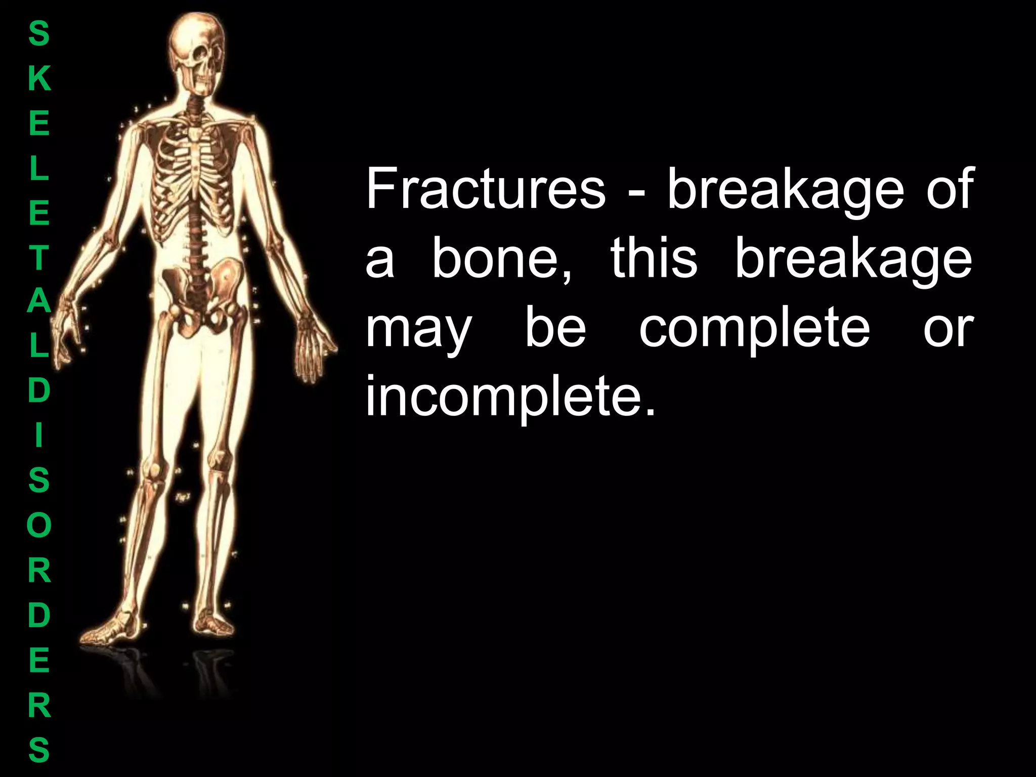 Skeletal disorders include fractures of different types such as simple, greenstick, compound, comminuted, impacted, and complicated fractures. Other skeletal disorders discussed include kyphosis, lordosis, scoliosis, arthritis, bone cancer, gout, osteoporosis, and rickets. Fractures involve breakage of bones, while kyphosis, lordosis and scoliosis are spinal disorders involving curvature of the spine. Arthritis is inflammation of one or more joints. Osteoporosis is thinning of the bones common in the elderly. Rickets is a childhood condition caused by vitamin D and calcium deficiency.