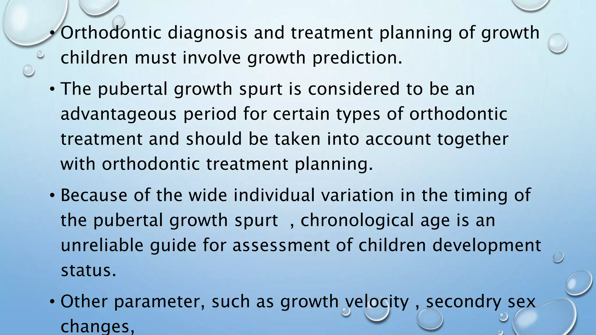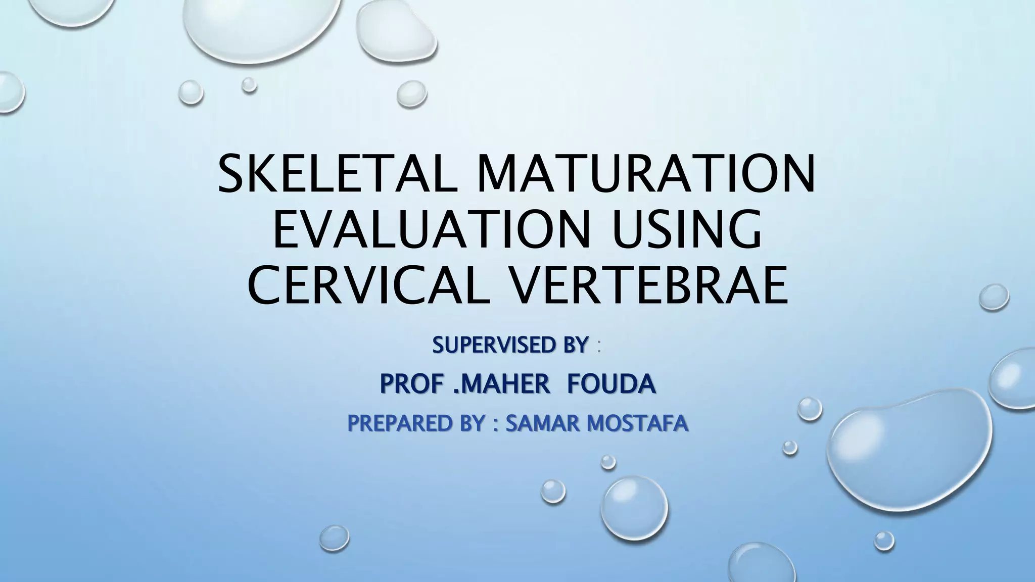 This document summarizes methods for evaluating skeletal maturation using cervical vertebrae on lateral cephalograms. It describes six stages of cervical vertebral maturation as defined by Lamparski, Hassel and Farman, Baccetti et al. Evaluating the shapes and concavities of C2-C4 can assess skeletal age and timing of growth spurts for orthodontic treatment planning. Quantitative analysis of landmarks on C2-C4 is also used to measure vertebral morphology objectively.