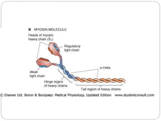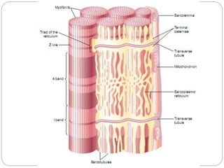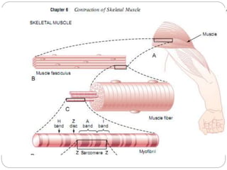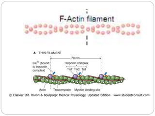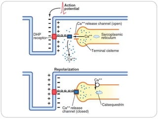 - Excitation-contraction coupling involves an action potential triggering calcium release from the sarcoplasmic reticulum, allowing calcium to bind troponin and initiate the contraction of actin and myosin